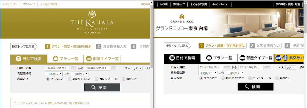 いま、カハラ横浜は自社サイトと一休で予約を受けているんですが、実は自社予約サイトはOne Harmonyのそれです。グランドニッコーと並べてみました。