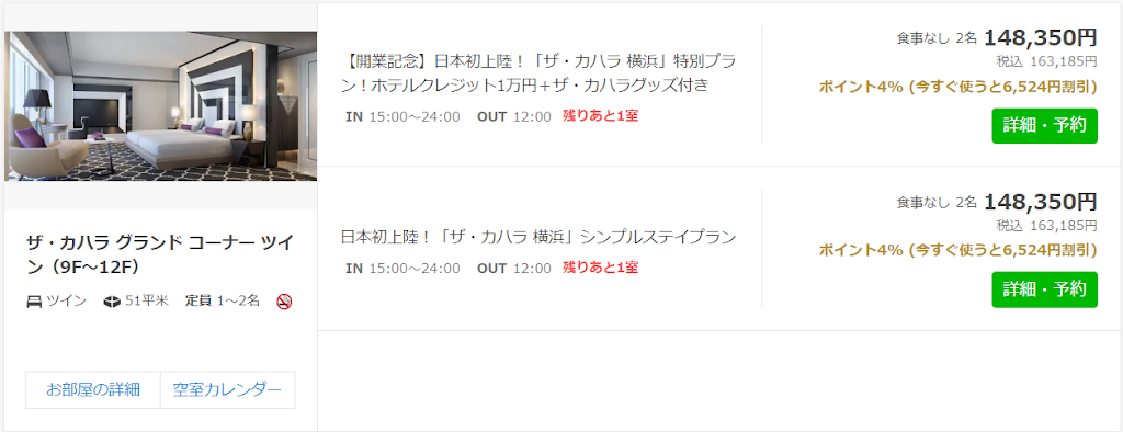 記事に掲載したお部屋は売れちゃって出ていませんね。開業日のグランド ハーバービュー ツイン(4F~8F)は税込127,513円でした。翌日18日の料金と同じみたいですね。