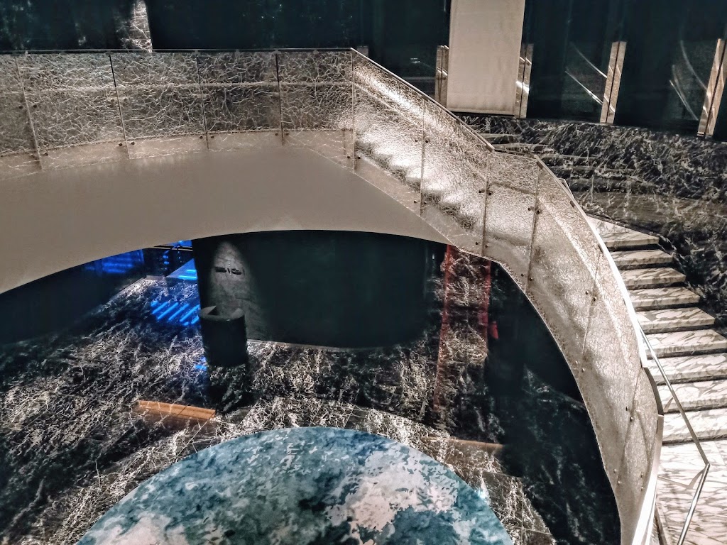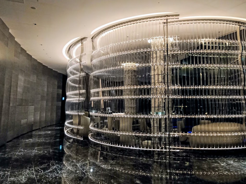 またガラス張りのロビー正面は、昼でもライトアップされた夜でも正面の建物が室内の構造物と一体するように見えて、空間の設計なんかも気合が入っていると感じました。