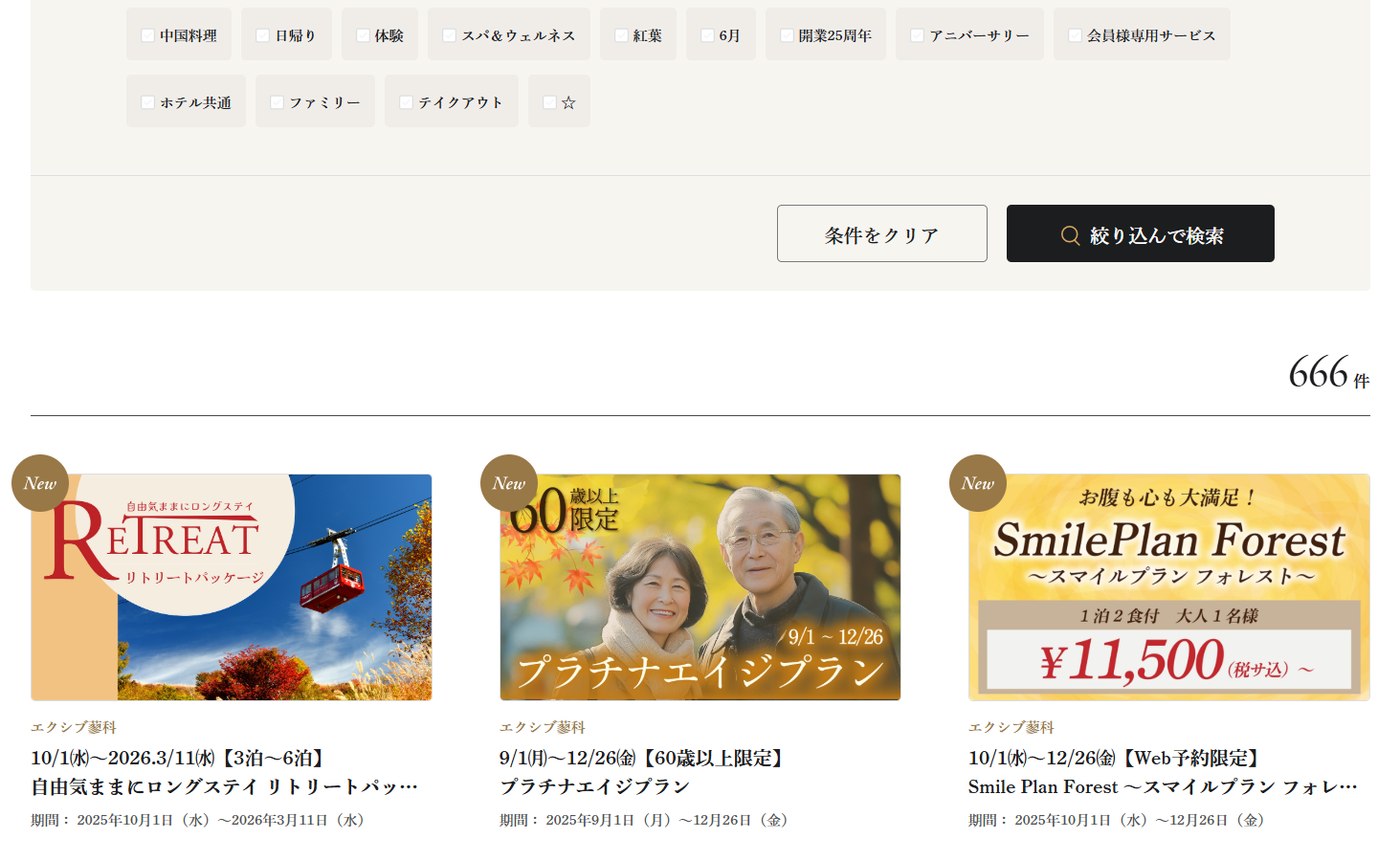いま、改めて同社サイトを見て驚いたのですが、全部のホテルの全部のプランを表示すると、実に666件の情報が掲載されています。