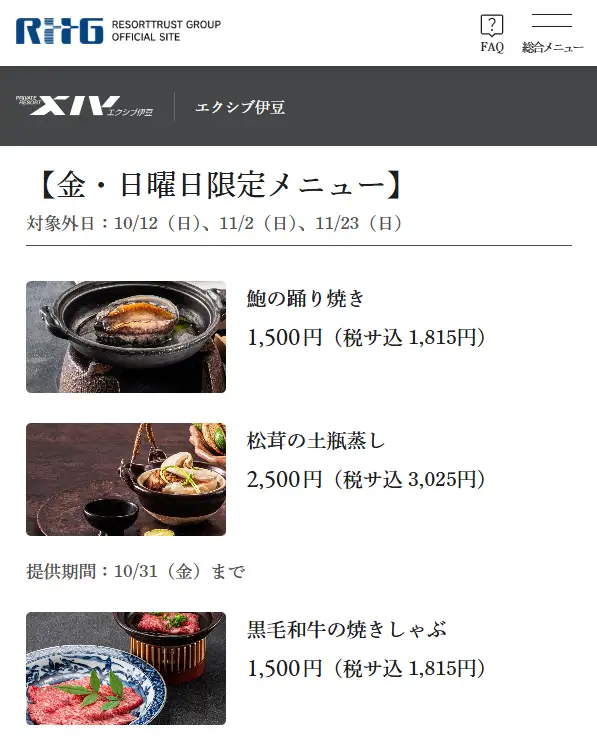エクシブ伊豆はレストランが2つありますが、このキャンペーンの対象は日本料理の黒潮だけです。キャンペーン適用日には、以下のメニューが「特別」に提供されます。