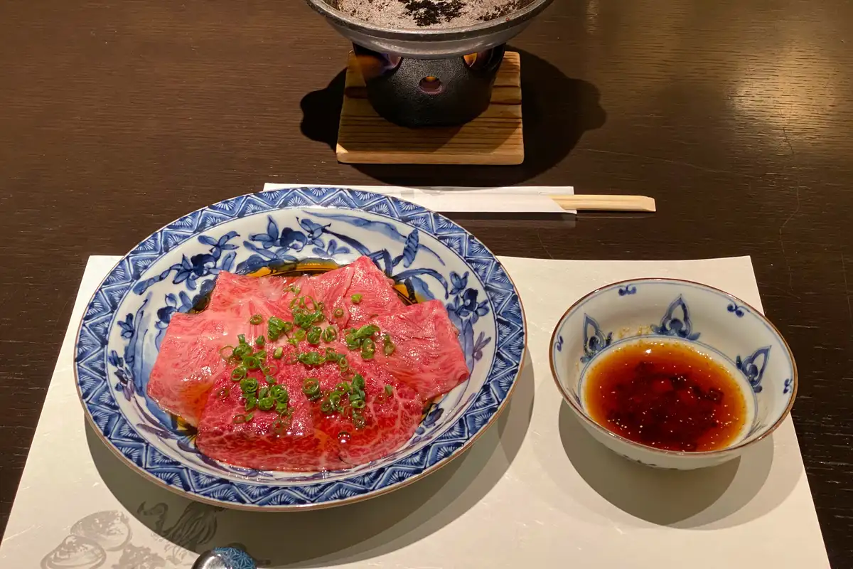 続いて黒毛和牛の焼きしゃぶです。この写真は今年の夏休みのもので、まだ2カ月以内のものですから、今もたぶんこんな感じでしょう。これもコースの一部でいただいたものですが、公式写真とお皿まで同じなので、きっと同じだと思います。