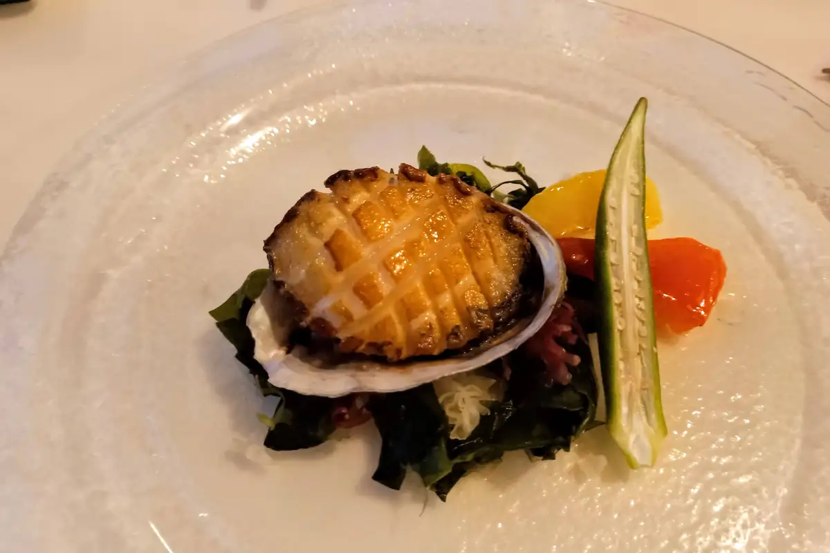 特別アラカルトはもう1つあって、それは「鮑の踊り焼き」、1,500円++(1,815円です)。僕は黒潮でこのメニューをいただいたことはありませんが、鉄板ブッフェであるラペールでは定番です。参考までにラペールで出た鮑の写真を掲載しておきます(オーダーダイニングの場合)。