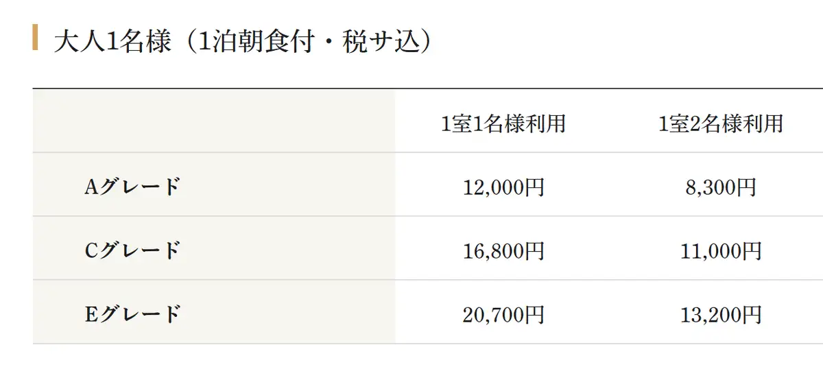 ディナーチョイスプランの価格は以下になります。おひとりさまでも室料と朝食が12,000円で済みます。
