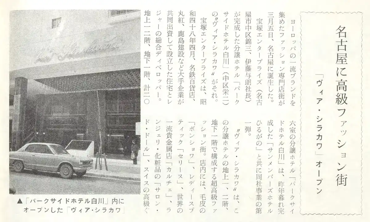 以下は同社発祥の地とも言える、現存する分譲型ホテル(マンション)の「ヴィア白川」が開業したときの雑誌記事です(出典:中部財界、1975年4月号)。1974年12月の同ビル開業に続いて、翌1975年3月5日、同ビルの地下1階から2階までがショッピングモールとしてオープンします。