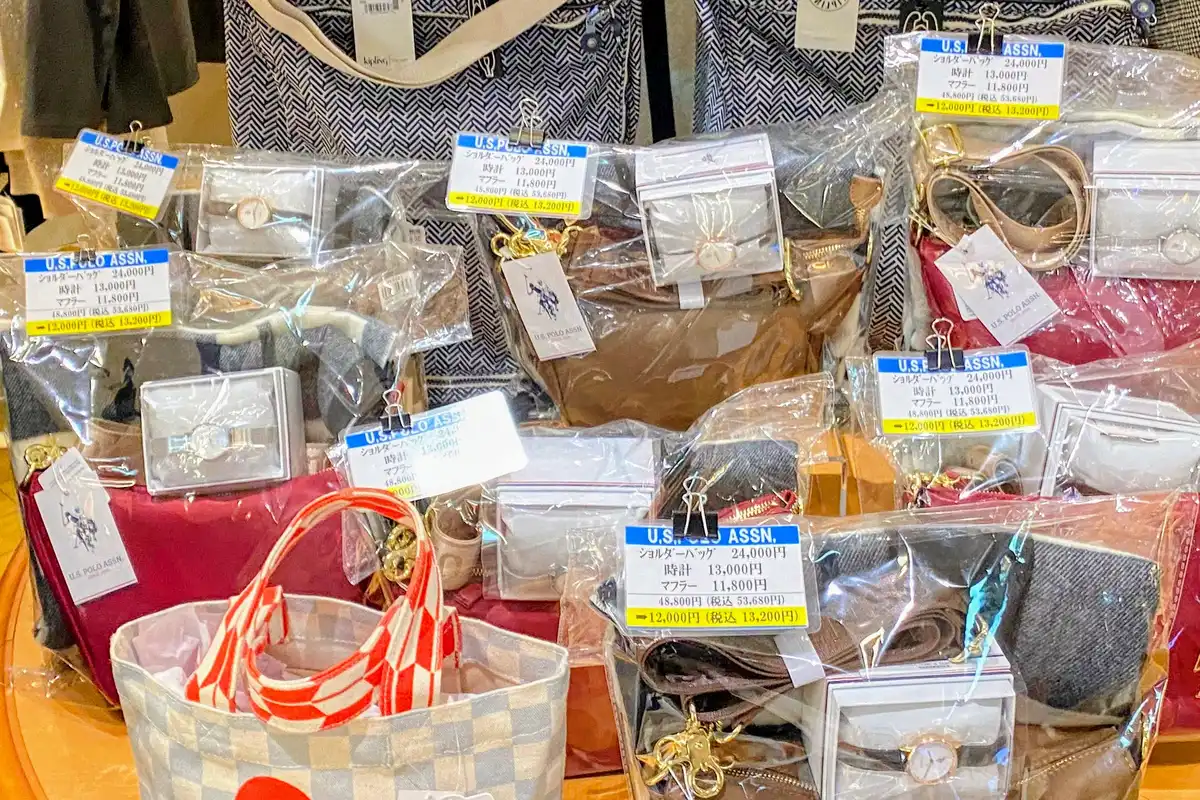 雑多でよくわからないと思いますが、このテーブルに並んでいる福袋は全部12,000円でした。中身は「U.S. POLO ASSN.」という全米ポロ協会公式の「正規ブランド」品で、バッグ、時計、マフラーの合計48,800円の商品がなんとこのお値段。