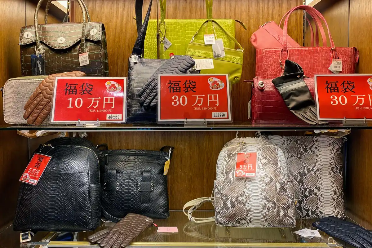 店内に入ってみると、もう少しお手頃価格のセットがありました。僕が見ても詳細はわからないんですが、5万円、10万円、30万円の福袋がショーケースに飾られていました。