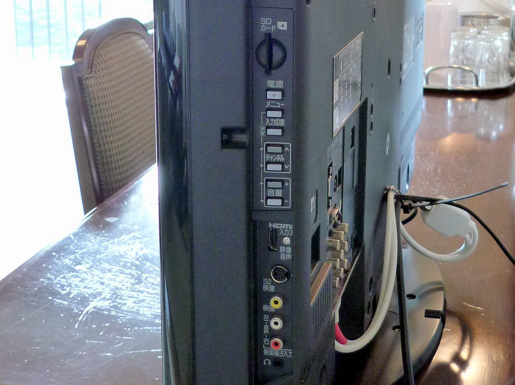 別にいまどきのデジカメでなくても、オールドファッションなS端子やピンプラグでも、上の写真のように接続端子が露出しているのだから、ケーブルさえ持っていけばきっとつながるだろう。