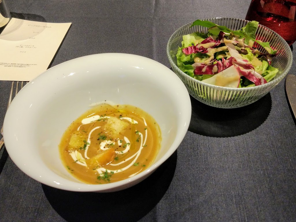メニューは、スープとサラダ、ビーフステーキ、ライス、という構成で、デザートやドリンク類は別途となっています。