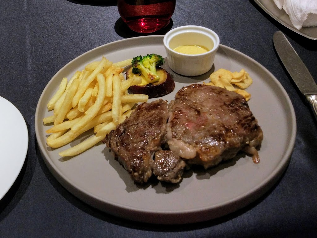 でも、最初に、サラダとスープに加えて、デザートが一緒に来ちゃうところがロックな感じです。デザート、来ちゃったら食べちゃうよね…。その後に肉が来るというのは、思い切ったな…。なりふりかまってはいられないと…。