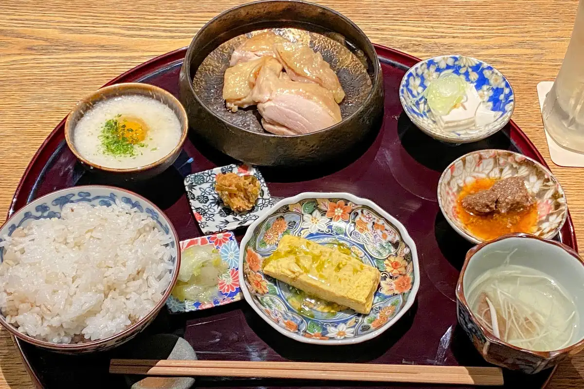 メインの鶏もも、月見とろろ、牛たんラー油、冷奴、漬物、南蛮味噌、テールスープ、麦飯がセットで、もう1つのおかずを5種から選べます。