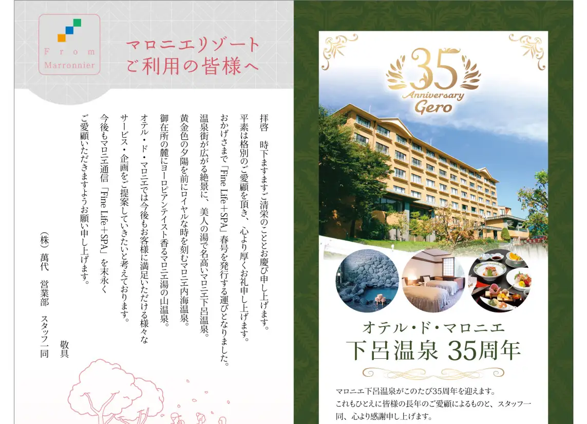 バブル期景気の真っ最中だったこともあり、会員権方式での開発は自然なことでした。こうして「オテル・ド・マロニエ下呂温泉 3」は、1987年着工、1989年開業。創業者の杤本正明氏が60歳になる直前のことでありました。