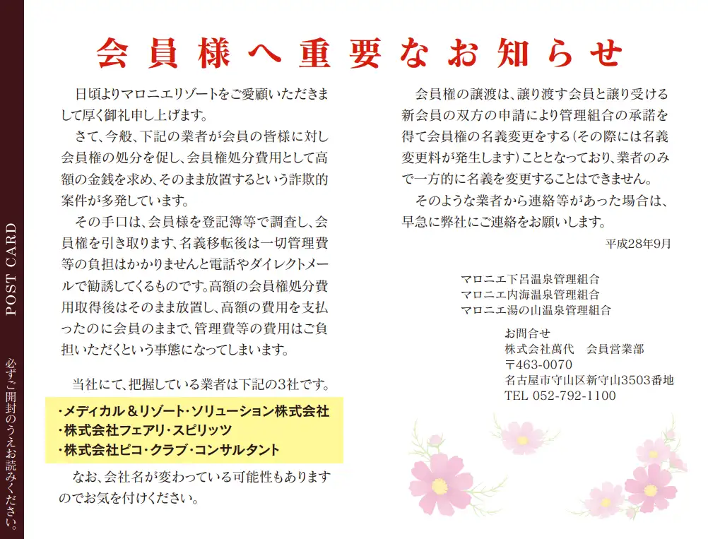 高齢会員が多くなったマロニエクラブでは、会員が「会員権引き取り業者」に騙されるケースが多発したのです。クラブからはこれは詐欺であるという警告が出るほどでした。