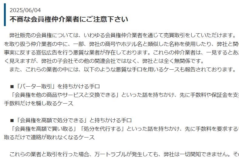 これまでも、仲介業者に関する警告は行われてきましたが、今回のように「処分」について同社が言及したのはおそらくはじめてのことです。エクシブ会員権の処分について悪徳業者が登場して金銭をだまし取るような状況になってしまったとは、時代は変わりましたね。