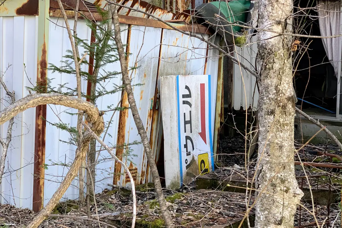 バス停横に車を停め、廃墟に近づきます。建物の裏には壊れた看板。感極まって、筆者は涙しました。