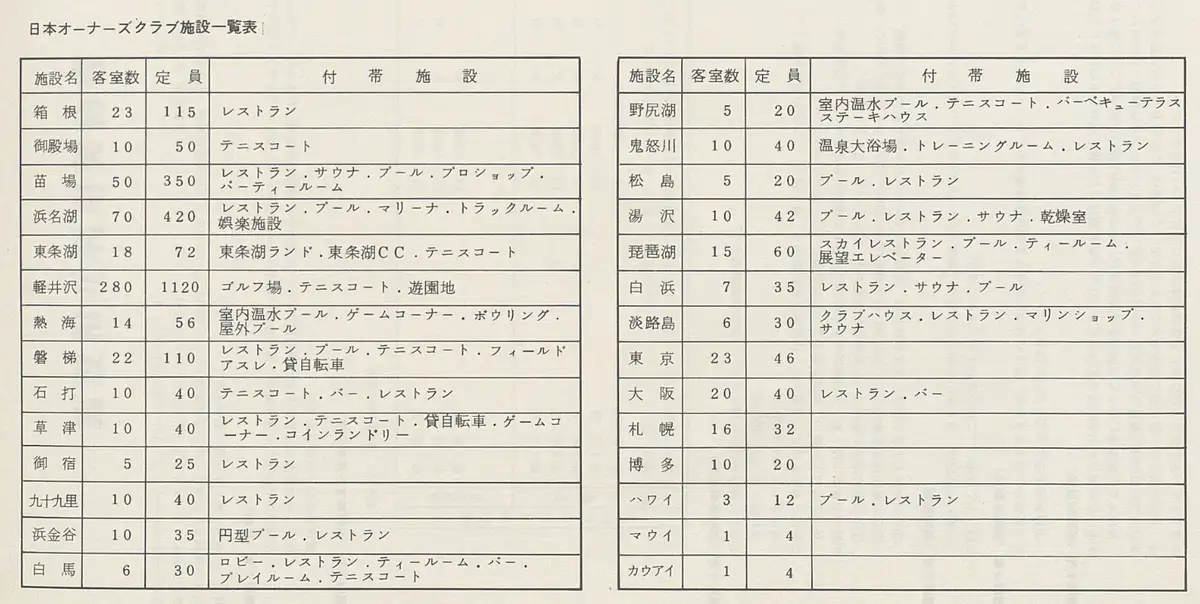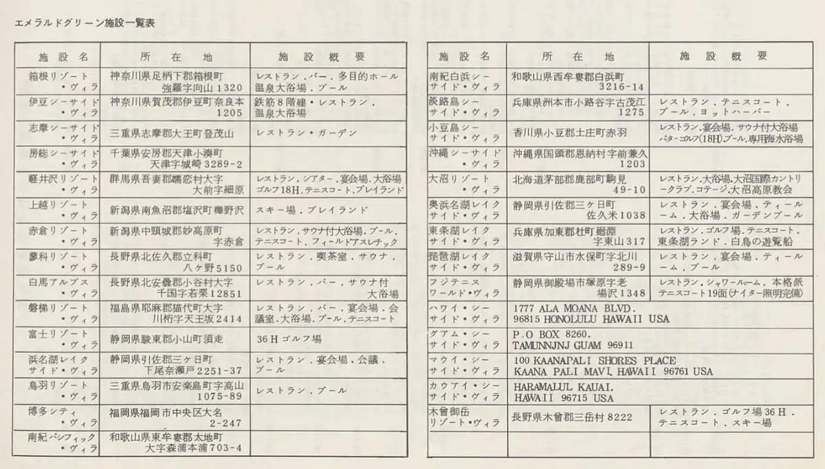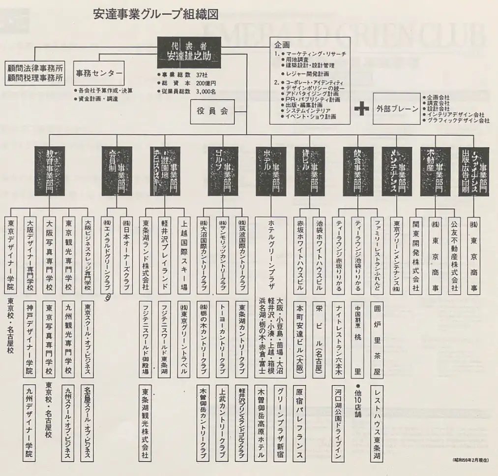 安達事業グループは、ルーツを専門学校(1958年「大阪デザイン研究所」20)とする複合グループ企業ですが、最も大きな会社となった「東京商事」9(1973年設立)のスタート以降、預託制のリゾート会員権、エメラルドグリーンクラブ 7(1973年発足)と、共有型会員権の日本オーナーズクラブ 8(1979年発足)の両輪で全国にリゾート開発を進めていました。
