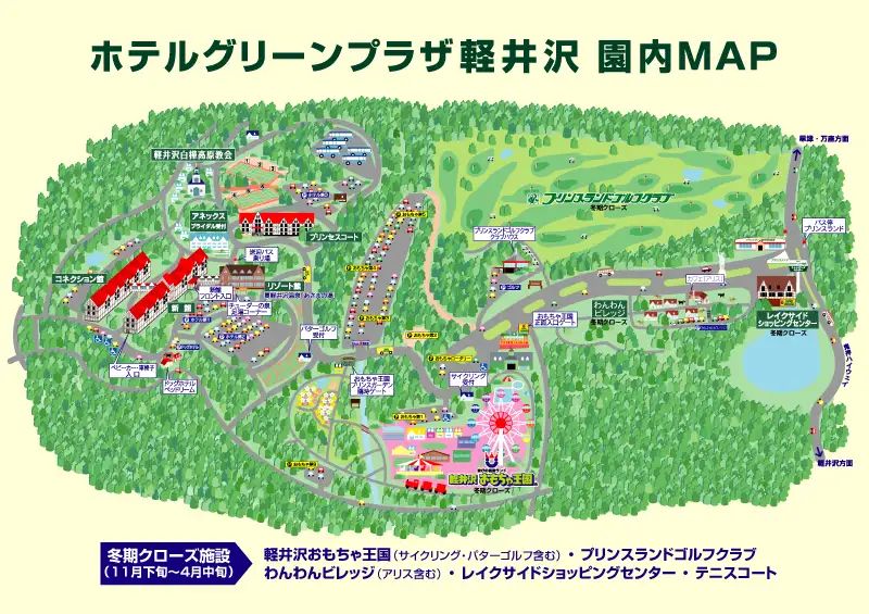 浅間高原エリアで唯一、子どもが主役のレジャー施設「軽井沢おもちゃ王国 1」と、「プリンスランドゴルフクラブ 2」を併設して、事業主がそれまでに蓄えたノウハウを壮大なスケールで実現した「ホテルグリーンプラザ軽井沢 3」であります。