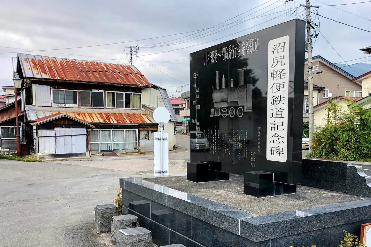 ローカル線の普通駅らしく駅舎はとても簡素で、かつて明治時代後半から1969年まで、沼尻軽便鉄道とJRとの接続駅として栄えたはずの面影は、今では感じられません。駅前はかなり広く、真新しい黒御影石の大きな記念碑が建てられていて、「高原列車は行く」の歌詞も刻まれていました。