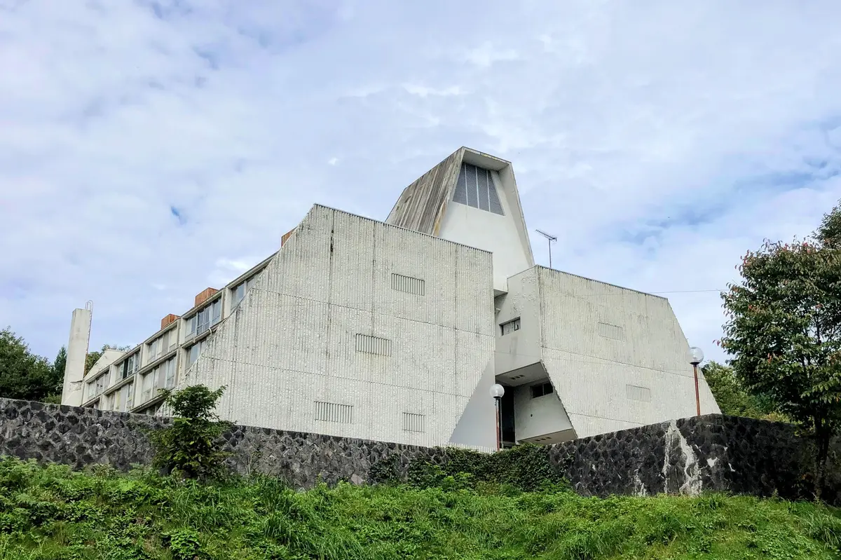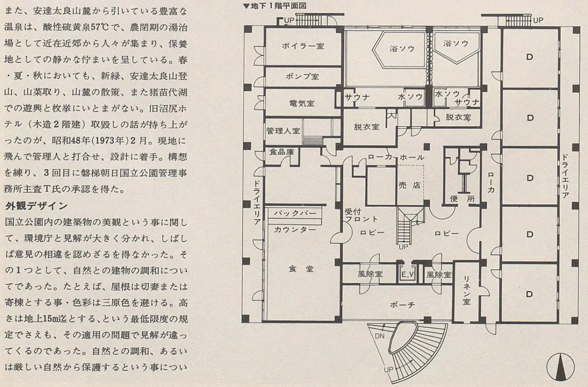 この建物ができたのは1974年12月で、サンメンバーズひるがのの開業と同時です。全35室ですから、それほど大きな建物でありませんが、コンクリート打ち放しの外壁、傾斜のある屋根の形など、美術館かと見間違うほどのスタイリッシュなデザイン。田舎風景が広がるこの一帯の中で、ずば抜けたセンスのリゾートホテルとして、50年前からずっとここに建っているのです。