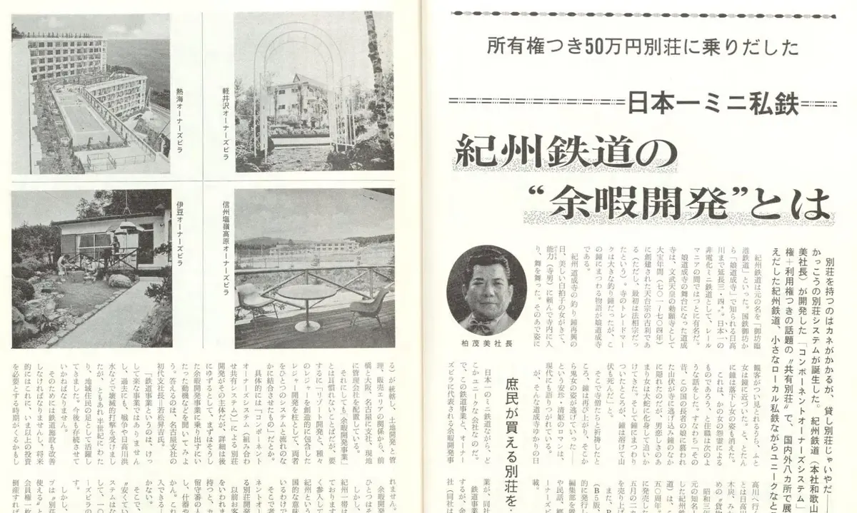 紀州鉄道でのリゾート事業の中心人物は、当時の社長、柏茂美氏という人でした。磐梯電鉄不動産以来、別荘地や小型リゾートマンションを開発し、会員権としてうりさばくべく「会員制ビラ」と呼んで事業を広げてきた紀州鉄道のリゾート事業は、この柏氏によってシステムの完成を見ます。