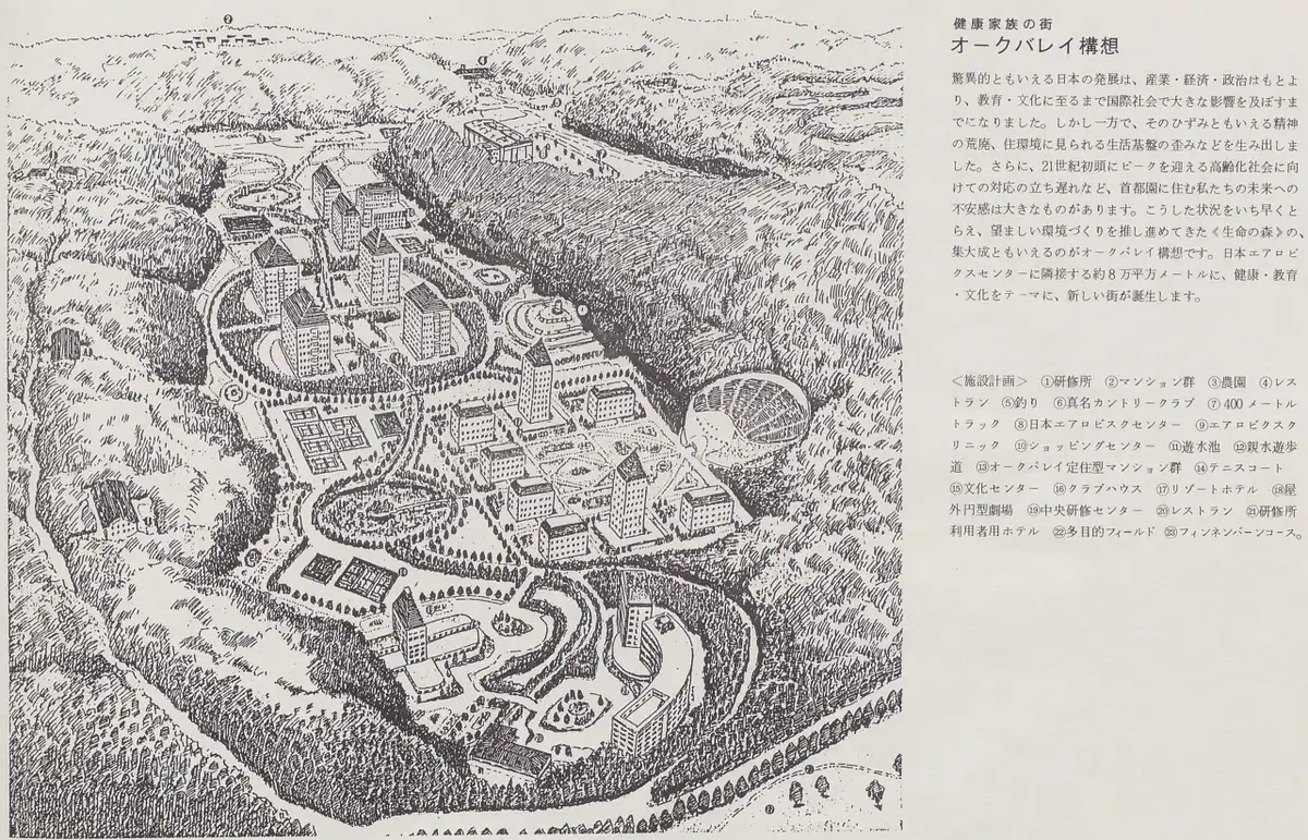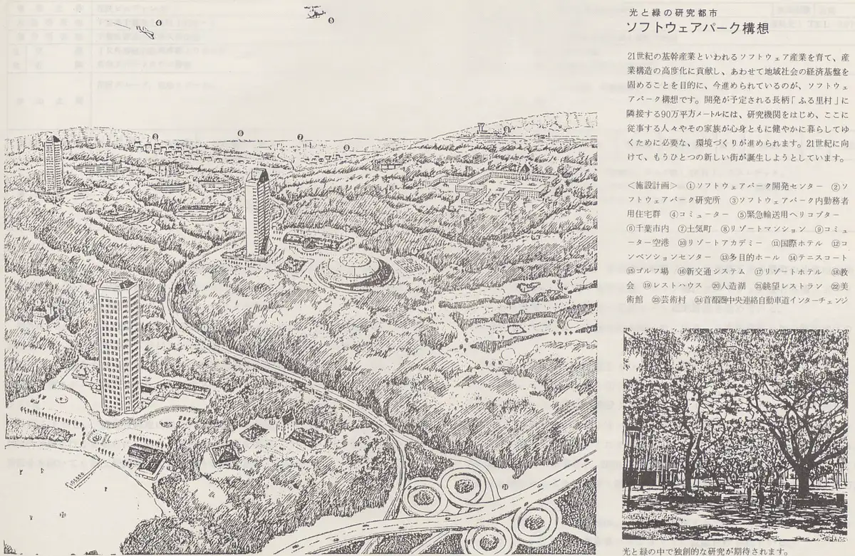 元の長柄ふる里村に、ゴルフ場と日本エアロビクスセンターを核とした現在の「生命の森リゾート」構想が加わり、さらに当時一世を風靡した「TRON計画 13」を軸にした電脳都市計画の3本立ての元、別荘やホテル、ゴルフ場はもちろん各種スポーツ施設を揃えた約100万坪にも及ぶ広大な総合リゾートが構想され、開発が進みました。