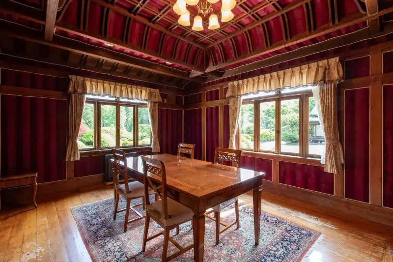 その象徴がトリニティ書斎の南側にある、全体のセンターハウスのような食事処「翠州亭 22」です。これはかつて東京にあって1978年まで使われた旧スイス大使館(さらに元は明治の実業家・華族の近藤男爵の別邸)が本リゾートに寄贈され、移築されたという由緒ある建物です。